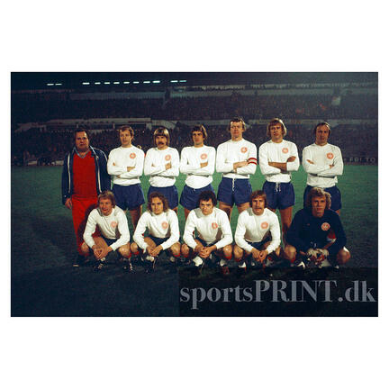 Bag. rk. Fra v. Landstræner Kurt Nielsen, Johnny Hansen, Flemming Ahlberg, Ole Bjørnmose, Henning Munk Jensen, Per Røntved, Niels-Christian Holmstrøm.