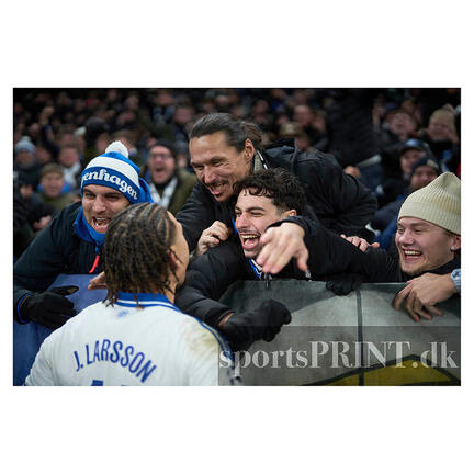 KØBENHAVN, DANMARK - 26. nov, 2025: Jordan Larsson, FC København jubler med fansene på Sektion 12 efter 2-0 scoringen på straffespark under Champions Legaue kampen mod Kairat Almaty. (Photo by Lars Rønbøg / FrontZoneSport )